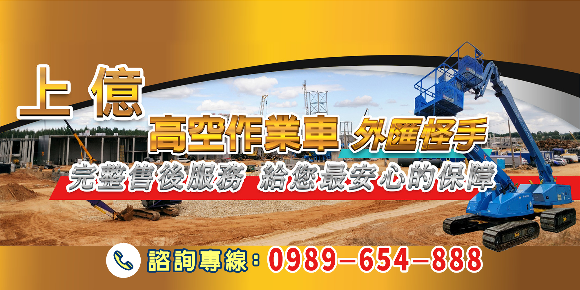 上億高空作業車、外匯怪手在嘉義當地專業提供各式高空作業車買賣、進口外匯怪手、自走剪刀車等營造土木工程需使用之重機械。